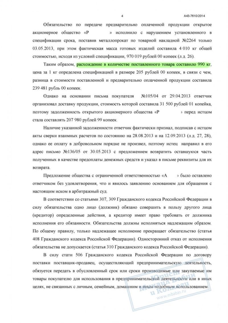 ООО «А» заключило с ОАО «Р» договор на поставку металлопроката с предварительной оплатой товара. Однако «Р» не выполнил своих обязательств в полном размере: товар был поставлен с нарушением срока и в меньшем количестве. Несмотря на уведомления, возвращать разницу поставщик не спешил, что и стало причиной обращения «А» в суд.