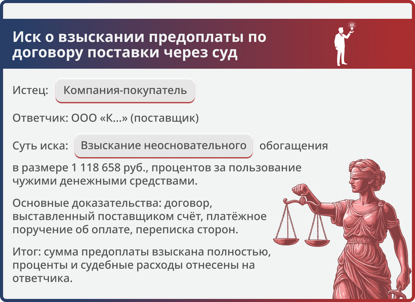 • сумма предоплаты — 1 118 658 руб., проценты за пользование чужими денежными средствами (в размере, определённом на дату вынесения решения), а также расходы по уплате государственной пошлины.