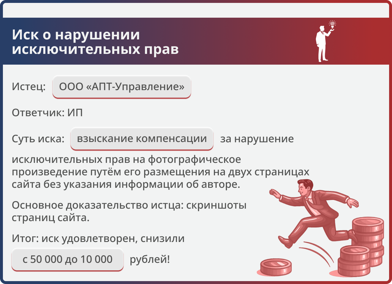 Истец требовал 50 000 руб. за незаконное использование фотографии на сайте ответчика. Юристы компании доказали, что ответчик является информационным посредником, а размещение фото на двух страницах — единое нарушение. Суд снизил компенсацию до 10 000 руб.