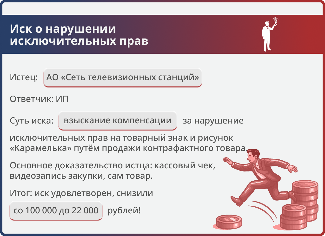 Истец (АО «Сеть телевизионных станций») обратился в суд с иском к ИП о взыскании 100 000 руб. компенсации за нарушение исключительных прав на товарный знак и произведение изобразительного искусства — рисунок «Карамелька» (персонаж анимационного сериала). В ходе рассмотрения дела в порядке упрощённого производства истец, ознакомившись с позицией ответчика, самостоятельно уменьшил размер исковых требований. Суд принял уточнение и рассмотрел дело по существу.