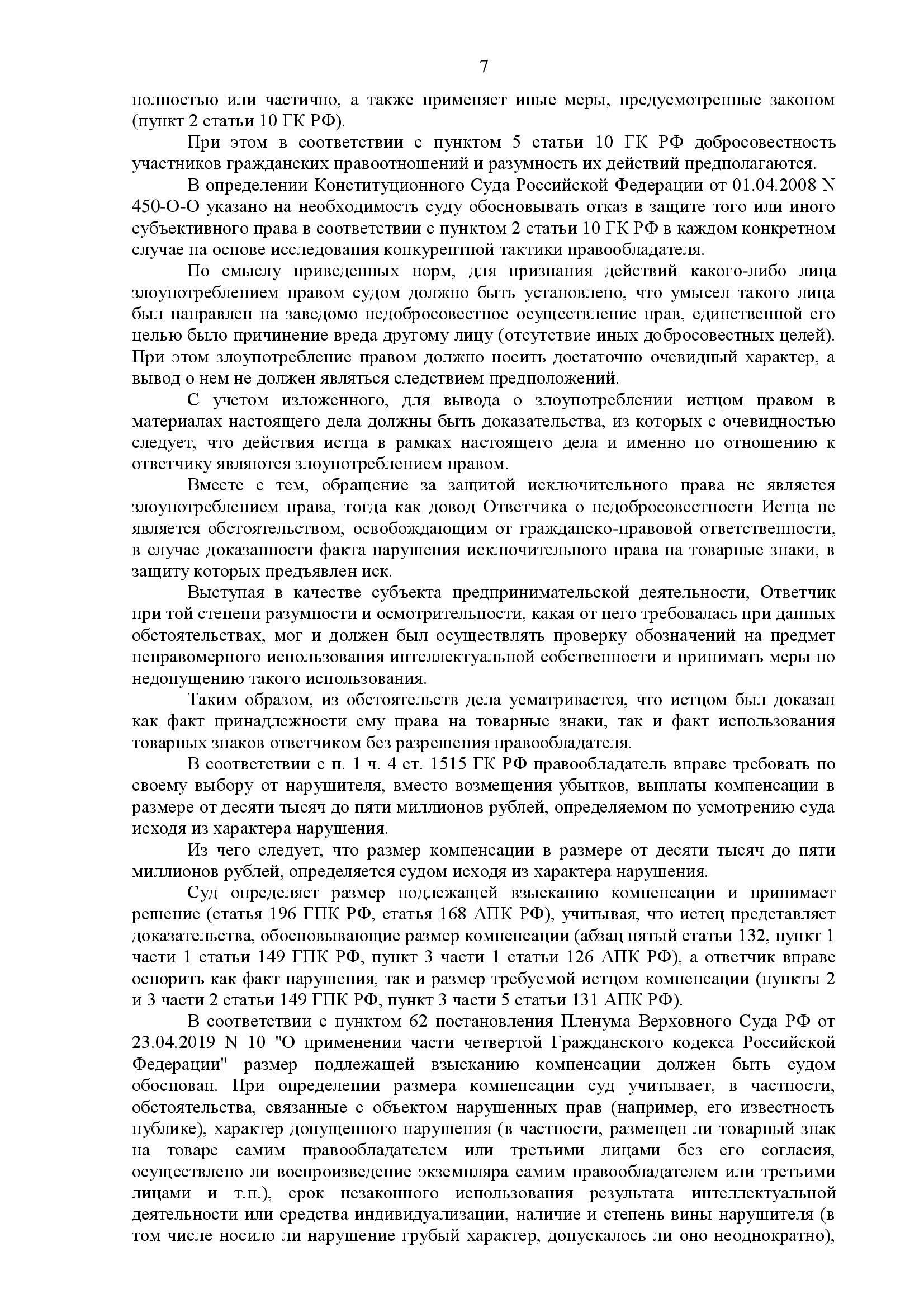 Защита настаивала на том, что три из четырёх товарных знаков фактически являются серией знаков одного правообладателя с общим доминирующим элементом, поэтому их одновременное использование на одном товаре должно рассматриваться как одно нарушение. Также ответчик указывал на несоразмерность заявленной компенсации, просил снизить её ниже минимального размера. Однако суд не усмотрел оснований для снижения ниже 10 000 руб., но применил принцип разумности и справедливости.