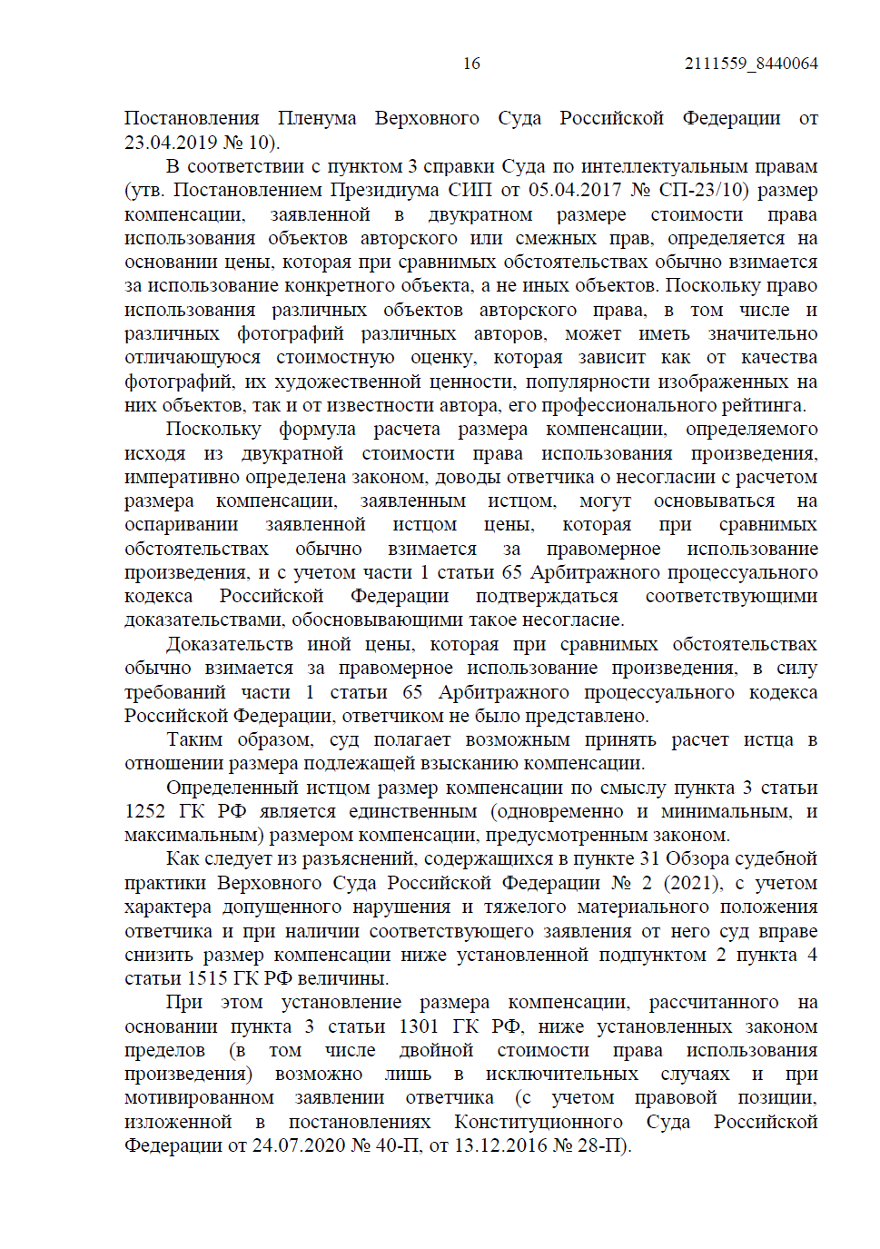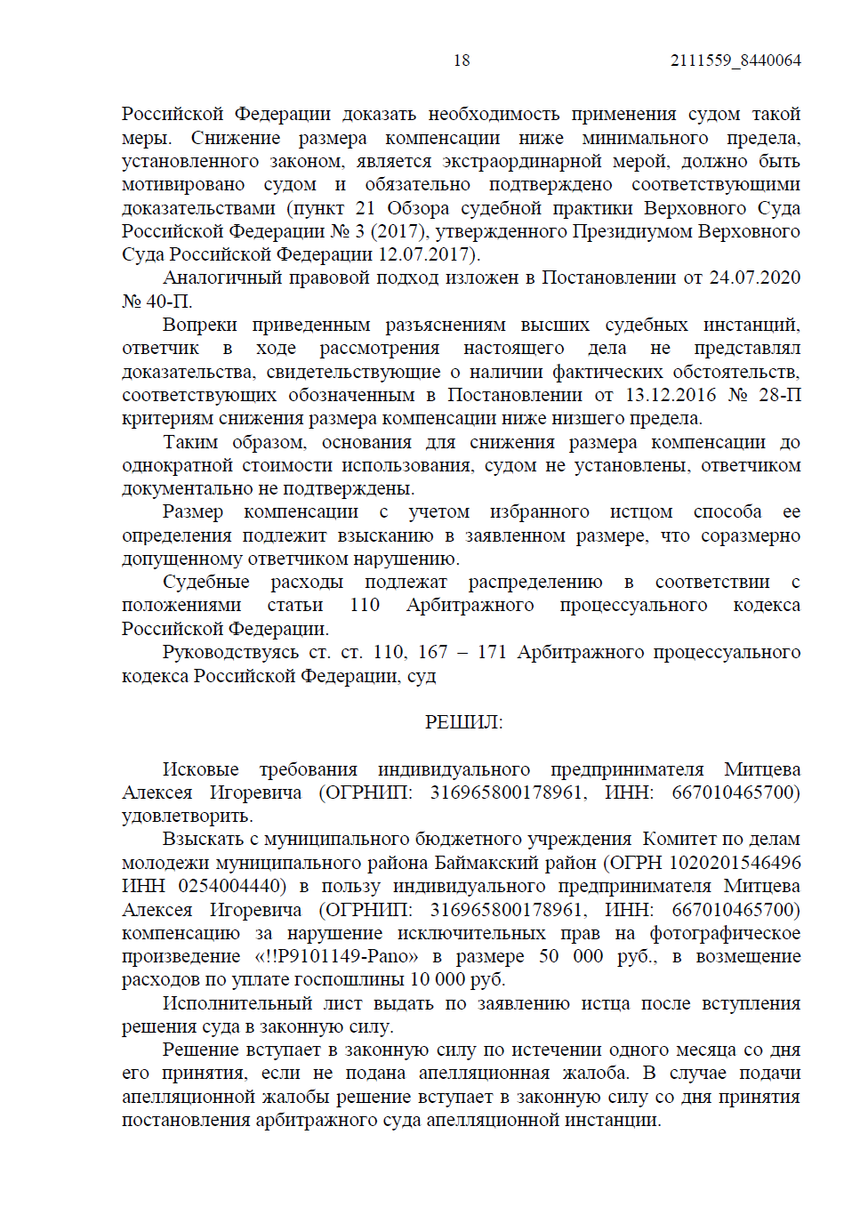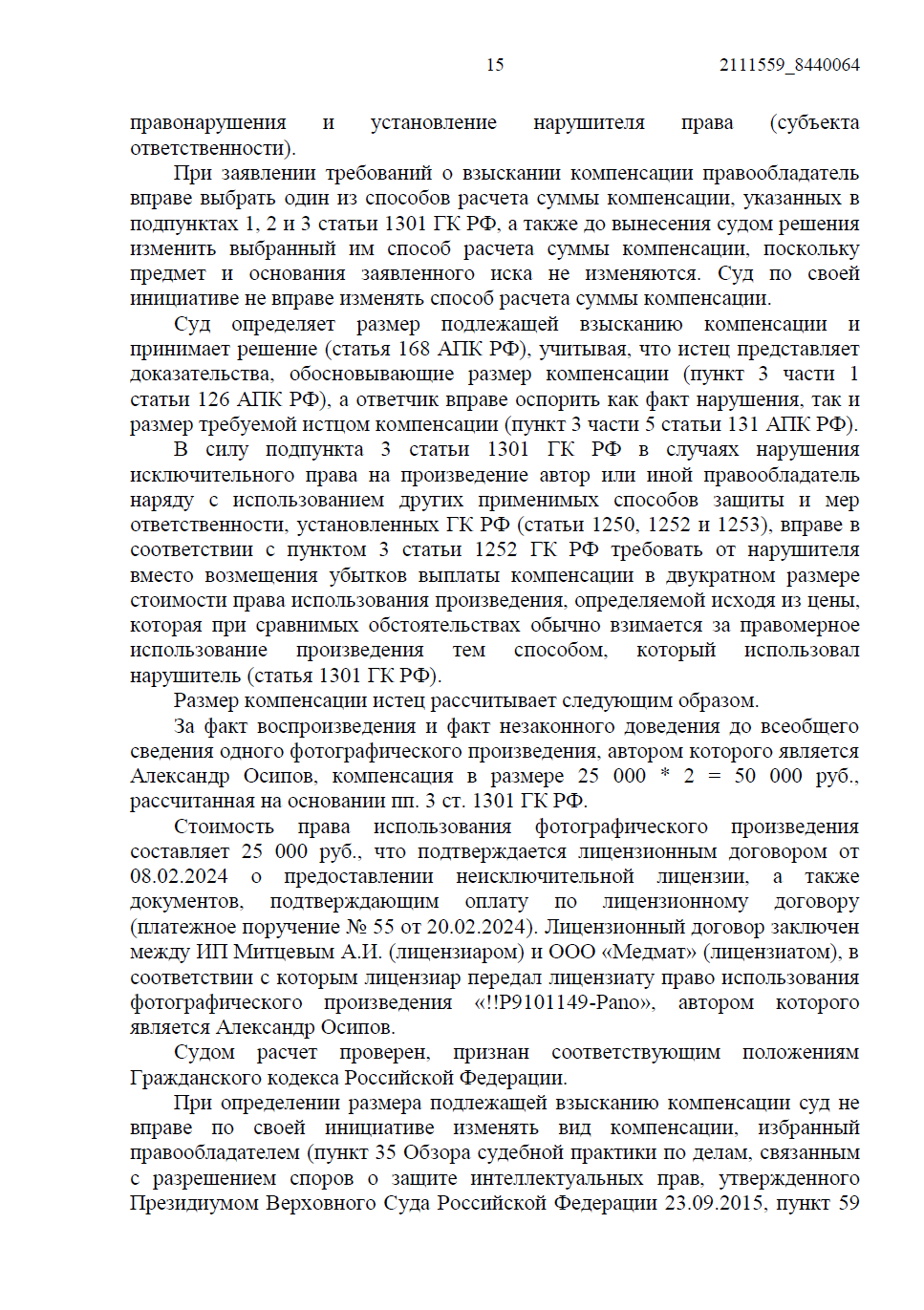 • Мы отказались от минимальных сумм и потребовали компенсацию в двукратном размере стоимости права использования. В качестве доказательства реальной цены была представлена рыночная сделка — лицензионный договор на это же фото, оплаченный сторонним заказчиком.