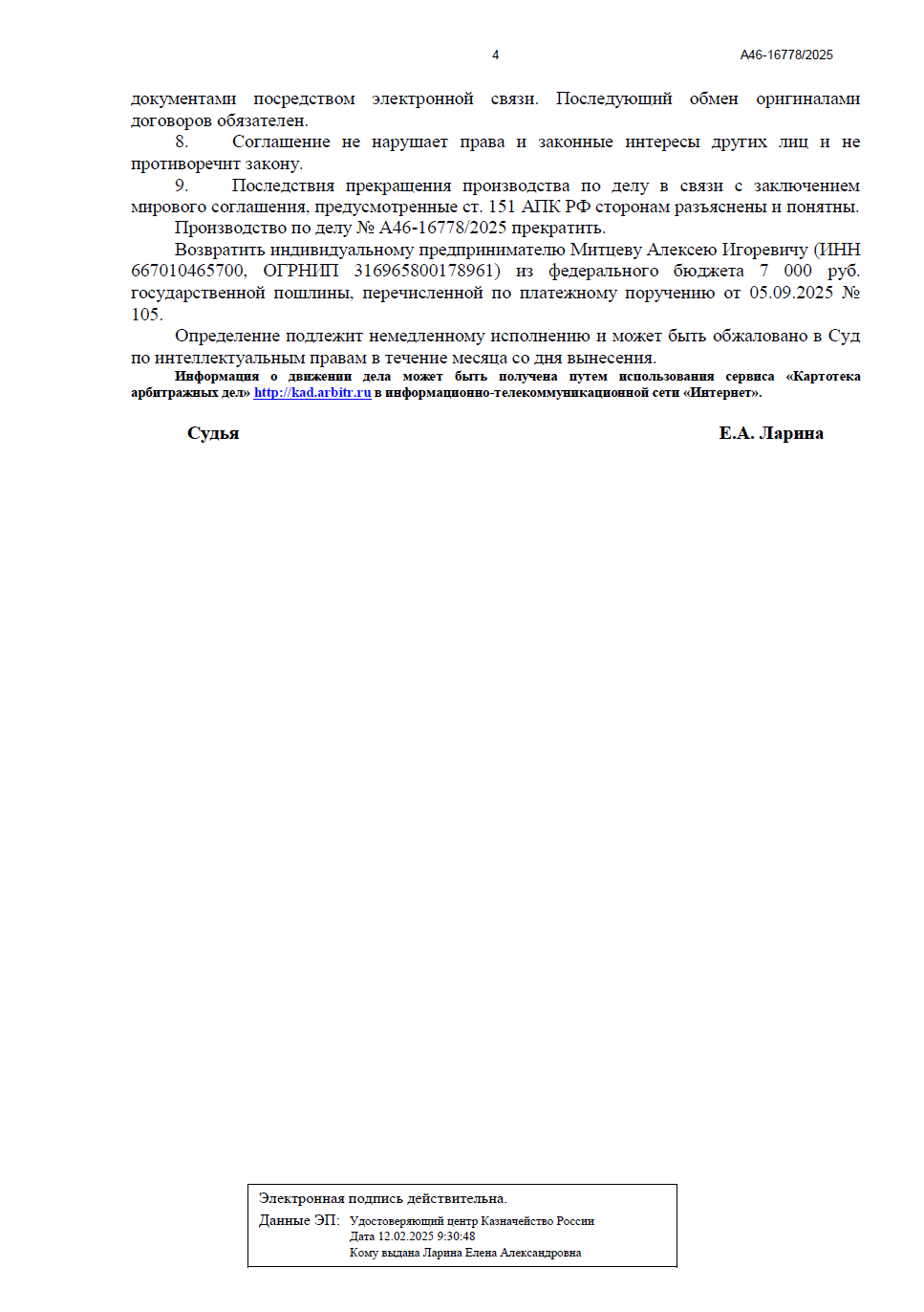 Мы подготовили неоспоримые доказательства авторства и нарушения исключительных прав. Ключевым этапом стала организация переговоров, в ходе которых ответчик признал обоснованность наших требований. Благодаря грамотно выстроенной позиции, стороны заключили мировое соглашение на максимально выгодных для нас условиях: