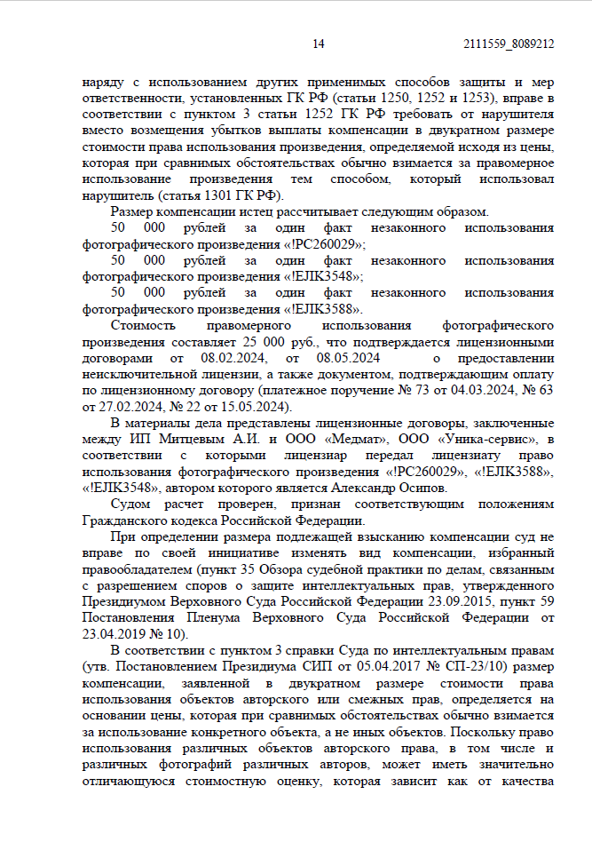 Мы предоставили реальные лицензионные договоры, по которым использование одной такой фотографии стоит 25 000 рублей.