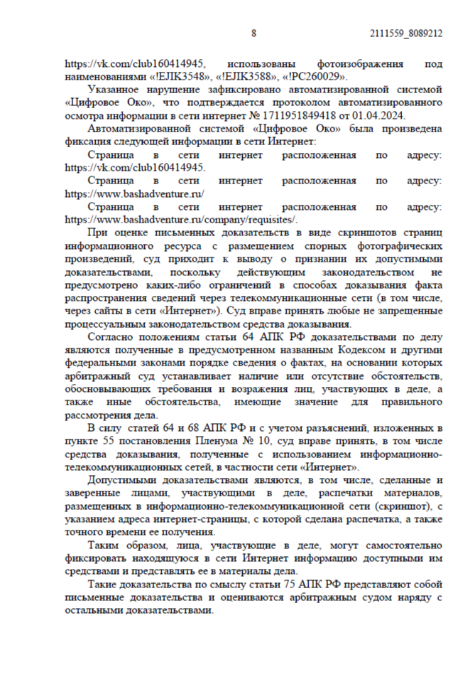 Нарушение было зафиксировано автоматизированной системой «Цифровое Око» (онлайн-сервис для фиксации информации в интернете, созданный для юристов, правообладателей и специалистов по интеллектуальной собственности). Мы собрали доказательства, нотариально подтвердили авторство и подали иск в Арбитражный суд Республики Башкортостан.