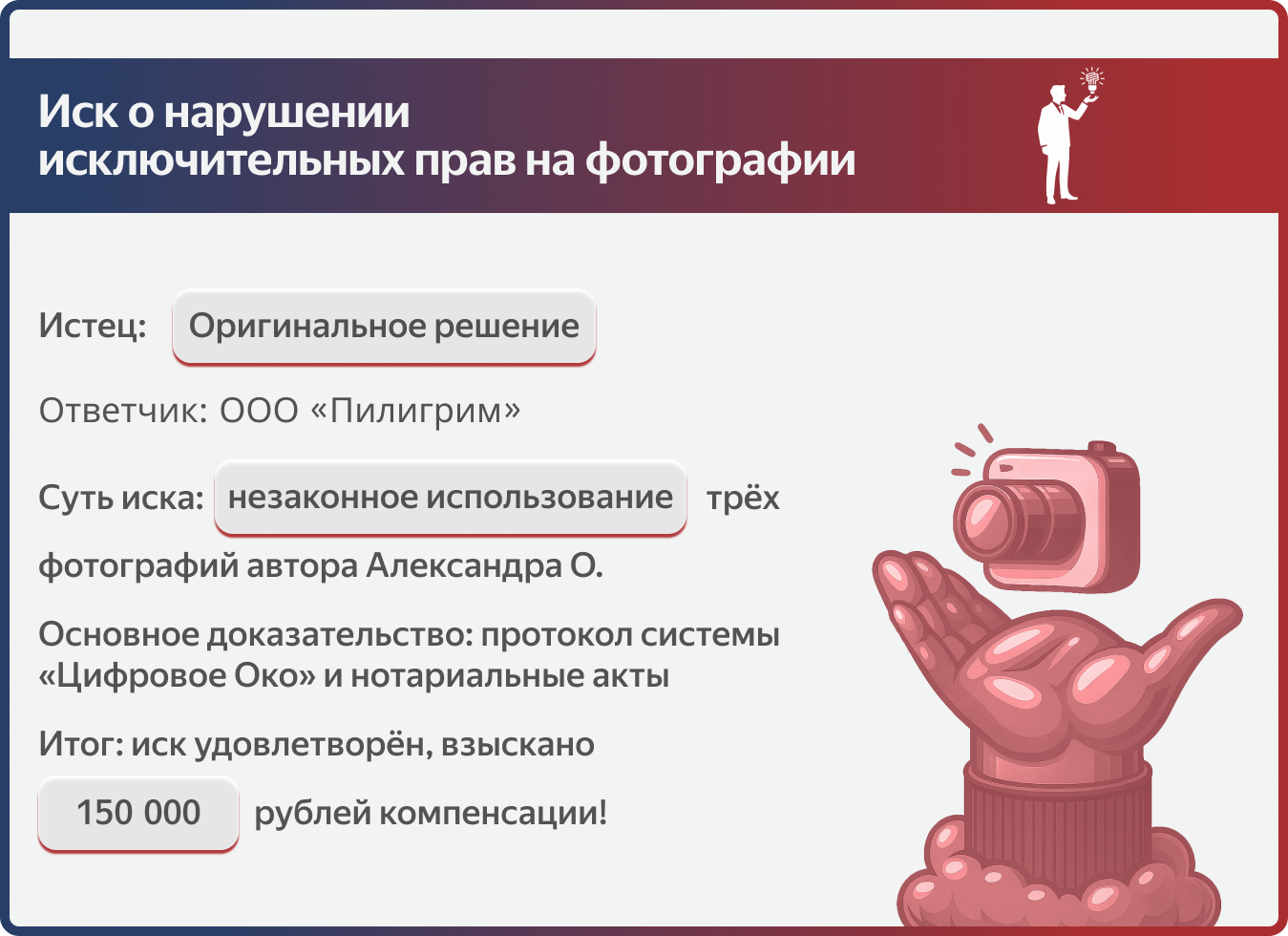 Защита авторских прав — это не формальность, а реальный инструмент. Мы помогаем фотографам получать компенсацию даже тогда, когда они сами не знают, что их работы используют незаконно.