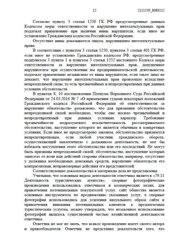 • Коммерческое использование наказуемо строже. Суд подчеркнул: так как ответчик — турагентство, фото использовались для извлечения прибыли и усиления привлекательности услуг. Это существенная часть бизнеса, что исключает снижение компенсации.