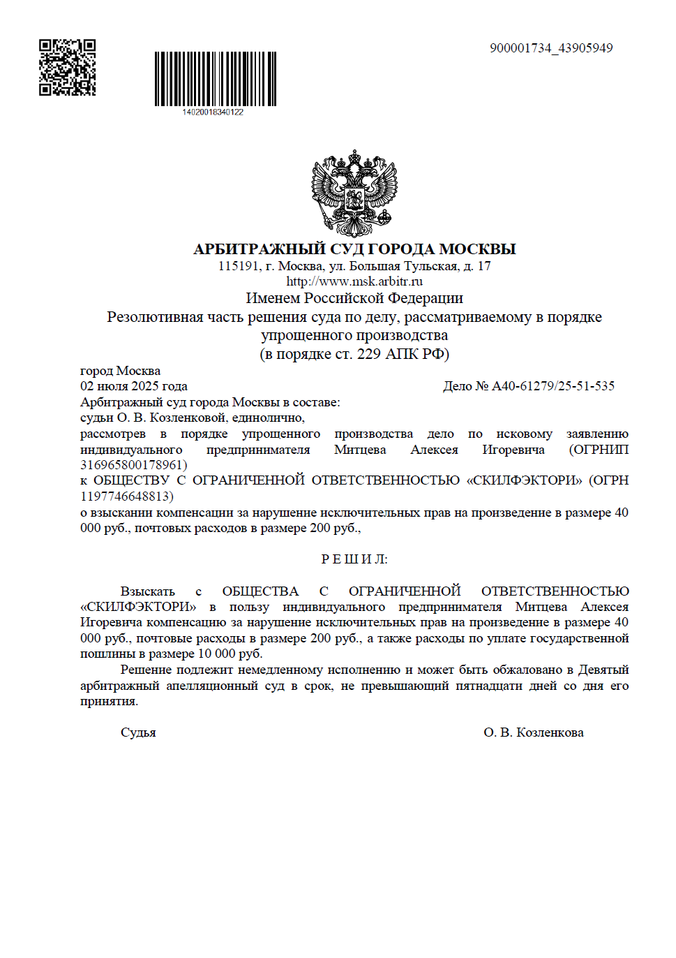 Спор рассматривался Арбитражным судом города Москвы в порядке упрощённого производства (без проведения классических судебных заседаний, на основании представленных документов и доказательств). Это формат, где особенно важны грамотная позиция и «сильный пакет» подтверждений — от правообладания до фиксации нарушения.
